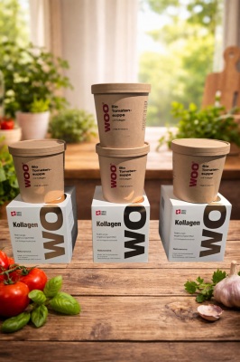 Sie erhalten für 207.- CHF 3 Packungen WOO Kollagen Sticks (1 x Natur Aroma / 1 x Pfirsich Aroma / 1 x Erdbeere Kaktusfeige Aroma) gratis wird eine Packung WOO Tomatensuppe mit Kollagen (4 Portionen) mitgeliefert.